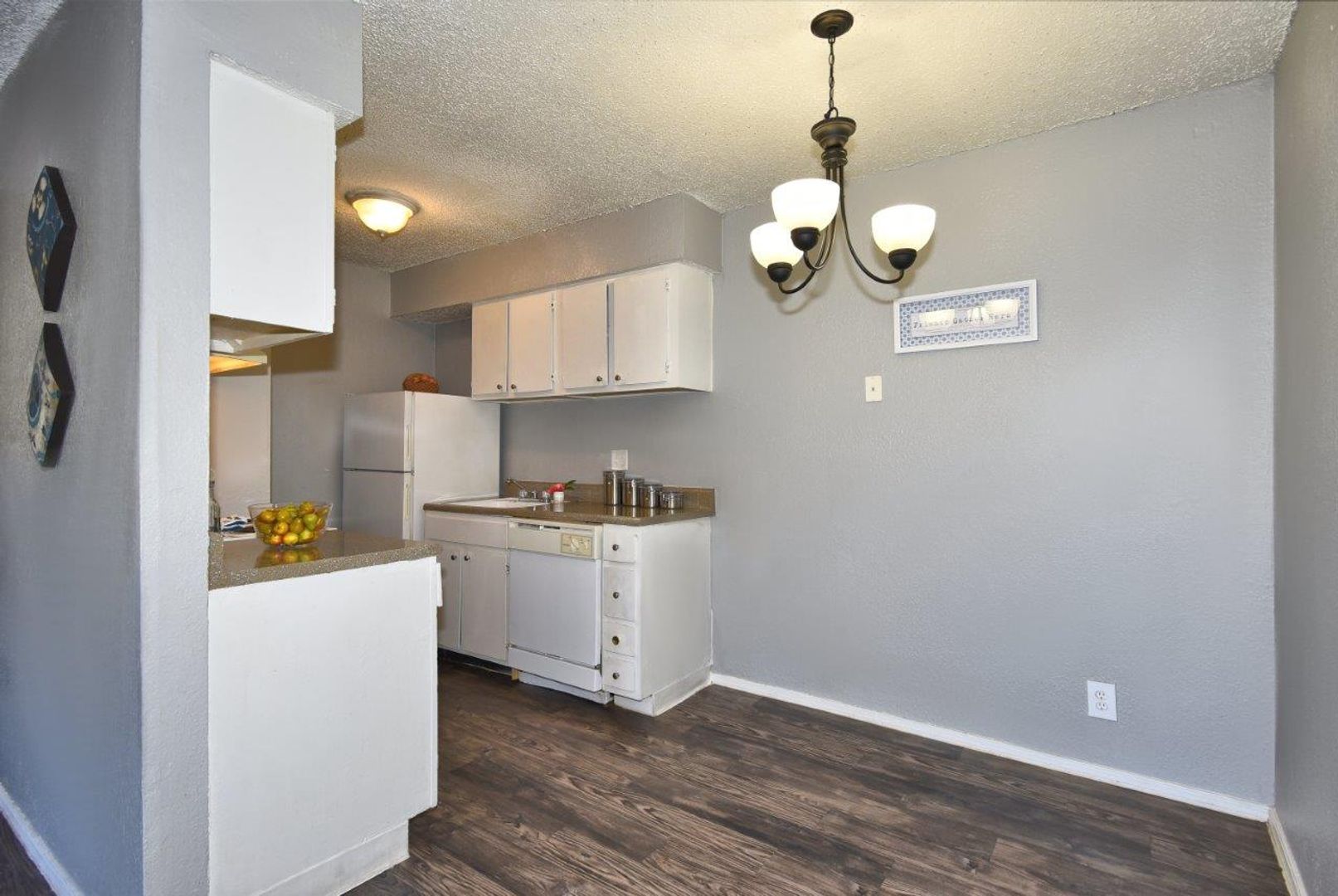 •Elegant vinyl wood flooring in the kitchen, dining, and bathroom